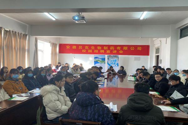 12月31日上午,安徽贝克集团副总经理蔡薇等一行4人在生命与健康科学学院会议室举办专场招聘会,学院2021届生物技术、生物工程、中药学、药物制剂、药学五个专业毕业生70多人参加招聘会。招聘会由学院党委秘书彭丽萍主持。